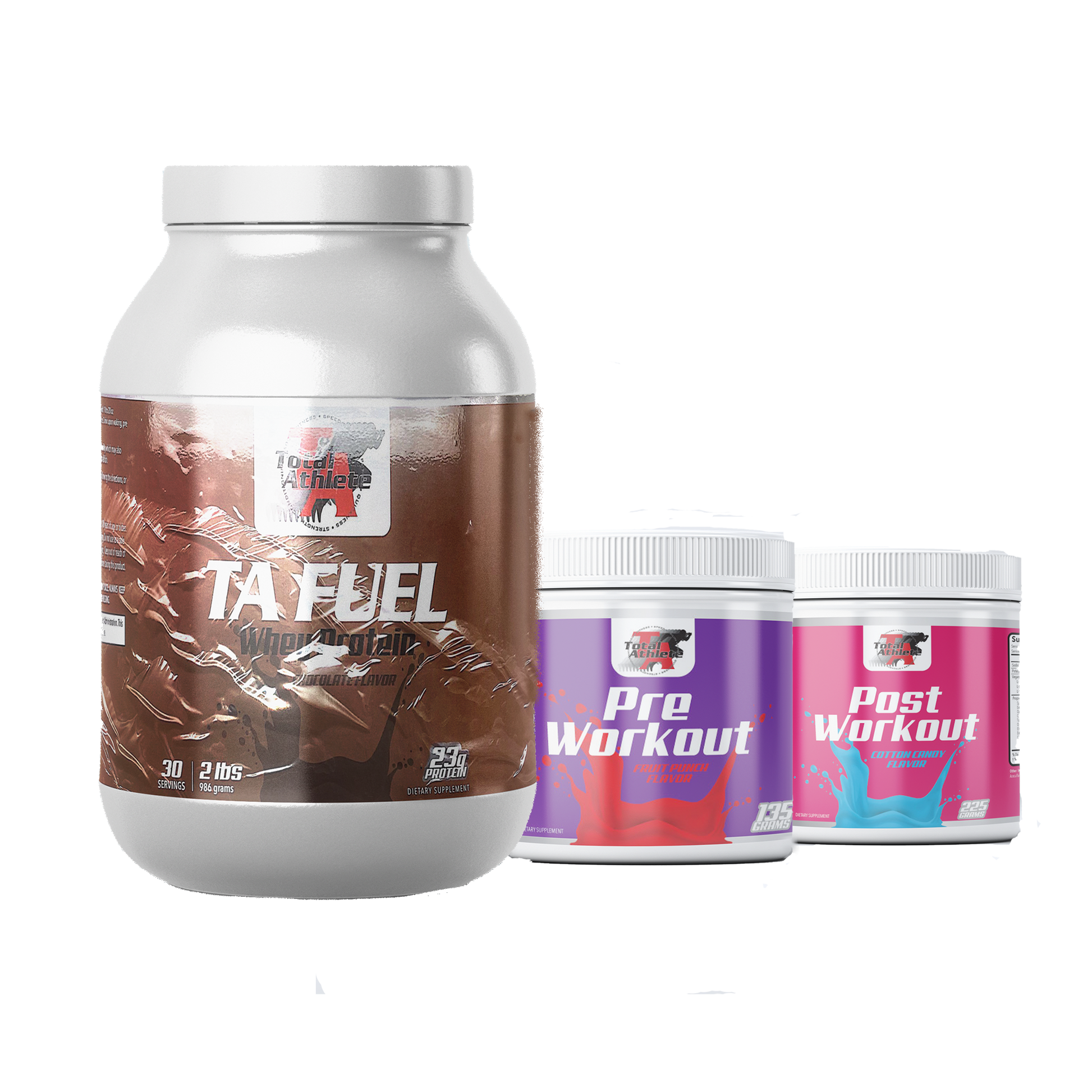 This package comes with TA Chocolate Protein, TA Fruit Punch Pre Workout, and TA Cotton Candy Post Workout.