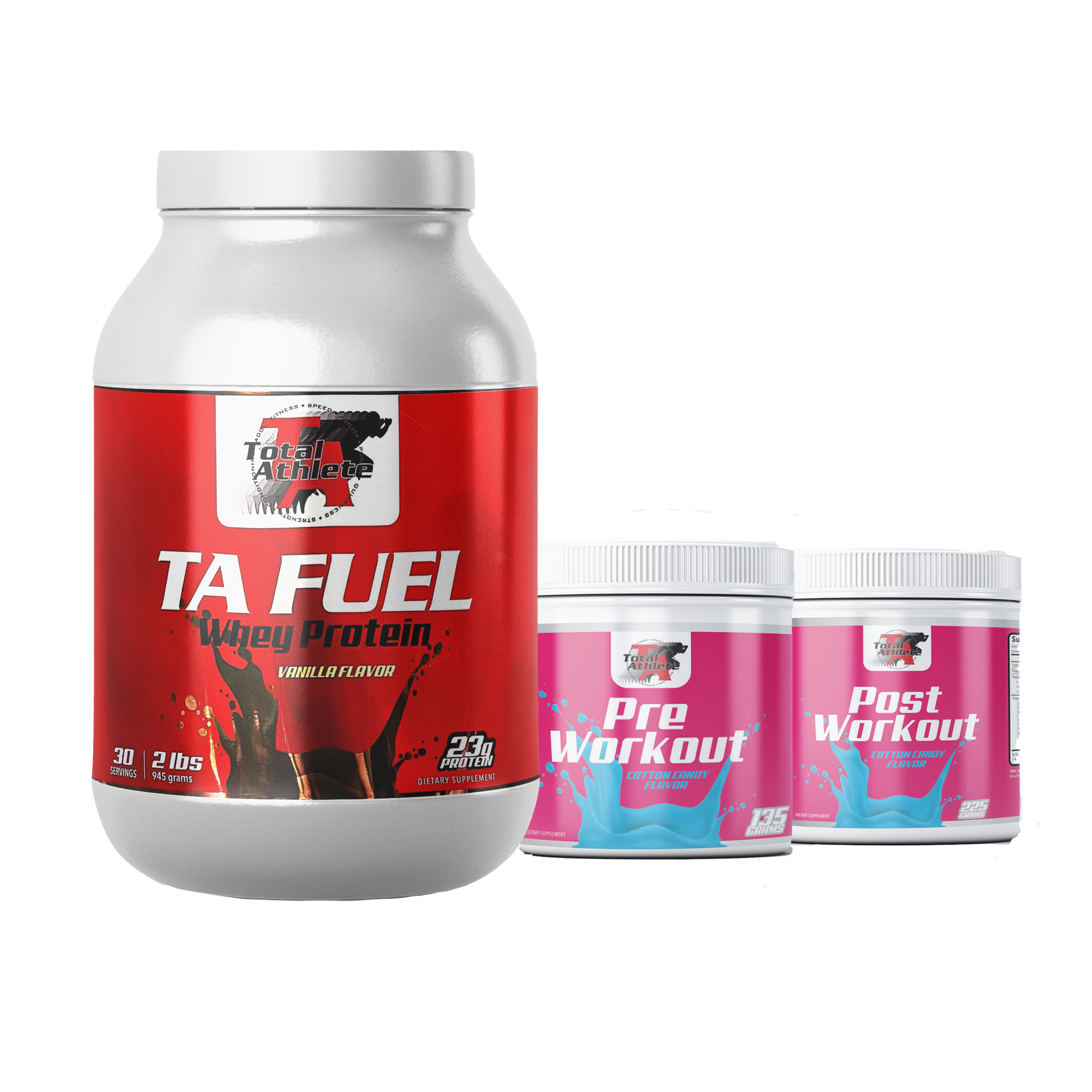 This package comes with TA Vanilla Protein, TA Cotton Candy Pre Workout, and TA Cotton Candy Post Workout.