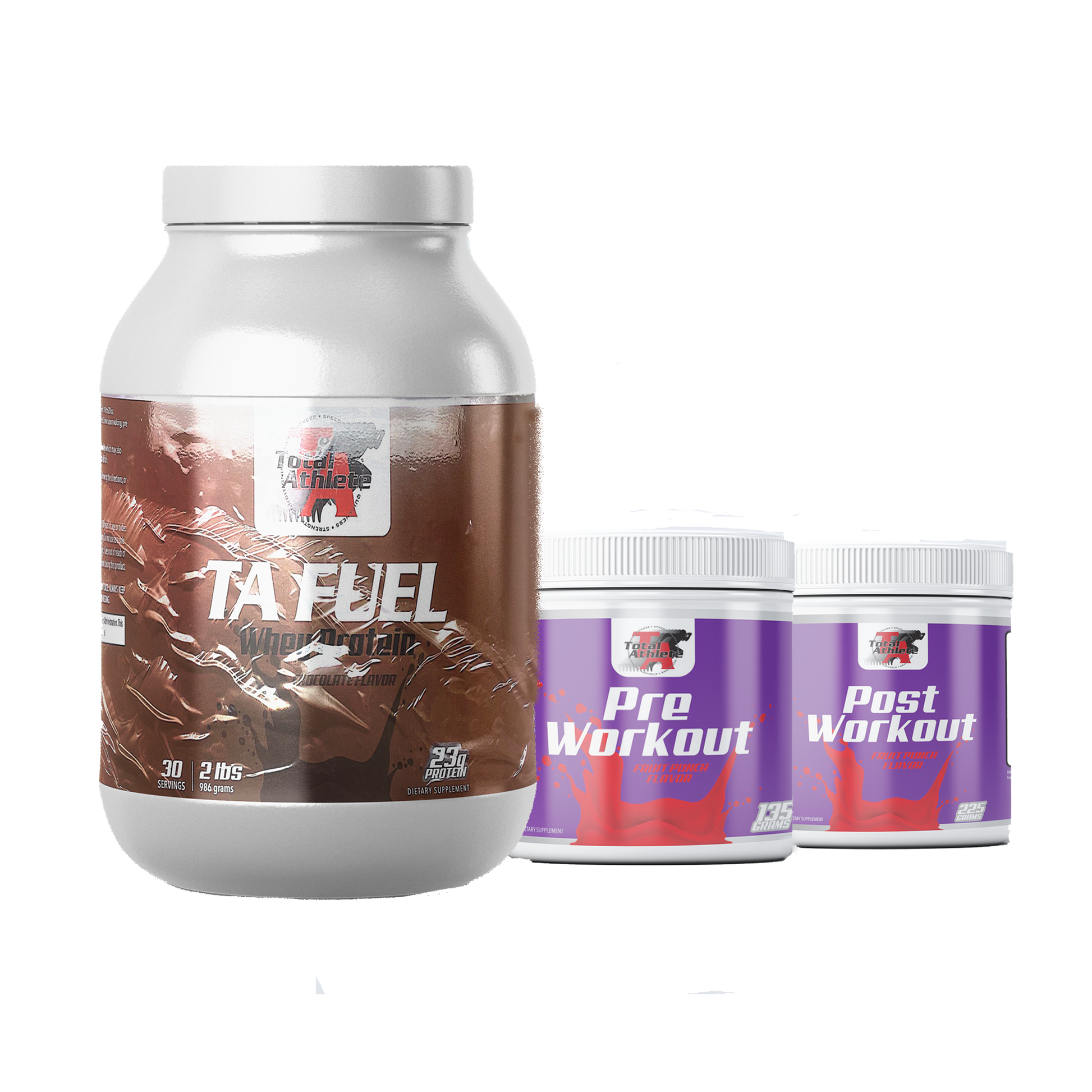 This package comes with TA Chocolate Protein, TA Fruit Punch Pre Workout, and TA Fruit Punch Post Workout.