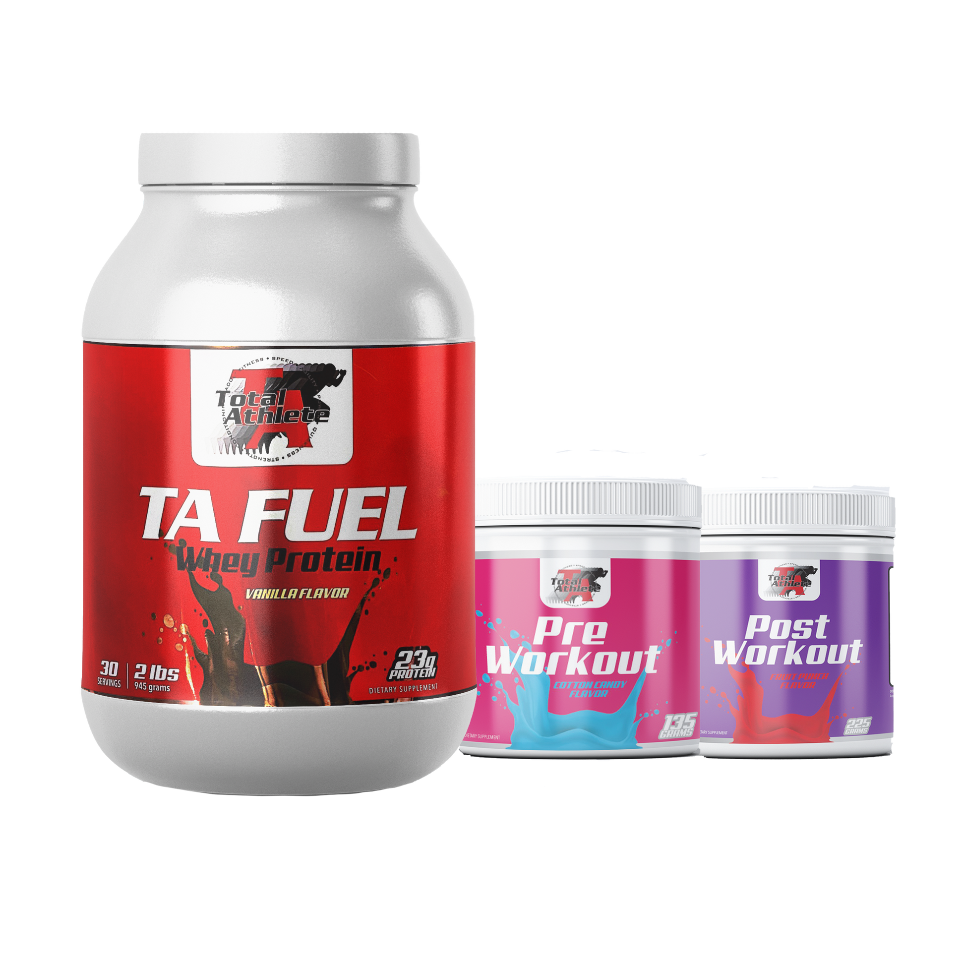This package comes with TA Vanilla Protein, TA Cotton Candy Pre Workout, and TA Fruit Punch Post Workout.